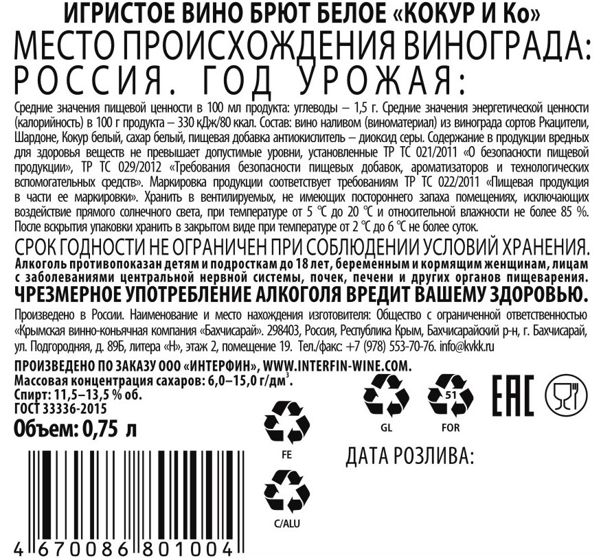 Вино игристое Валерий Захарьин Кокур и Ко белое брют, 0.75л