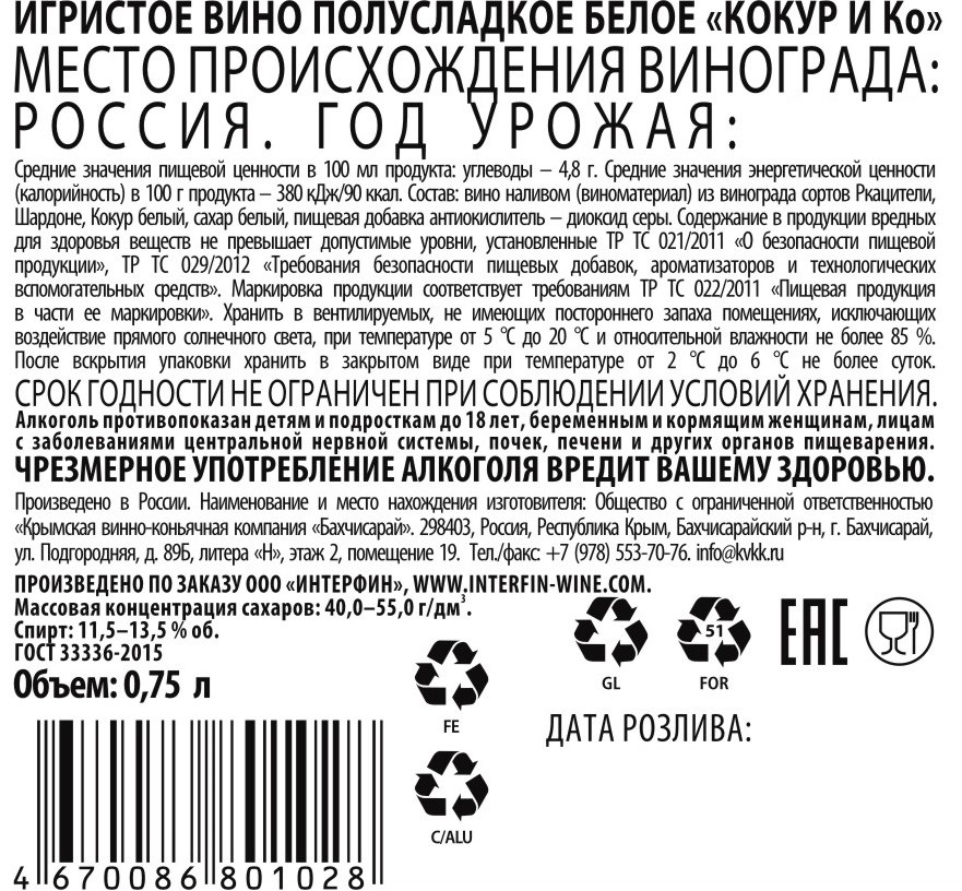 Виноматериал из винограда свежего сортов Шардоне, Ркацители, Кокур белый, сусло виноградное концентрированное, пищевая добавка - антиокислитель диоксид серы.