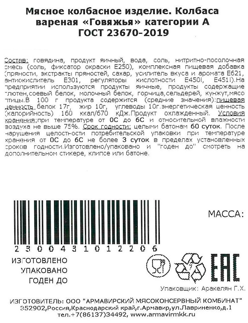 Говядина, продукт яичный, вода, соль, нитритно-посолочная смесь (соль, фиксатор окраски E250), комплексная пищевая добавка (пряности, экстракты пряностей, сахар, усилитель вкуса и аромата E621, антиокислитель E301, регуляторы кислотности E4501, E4511).
