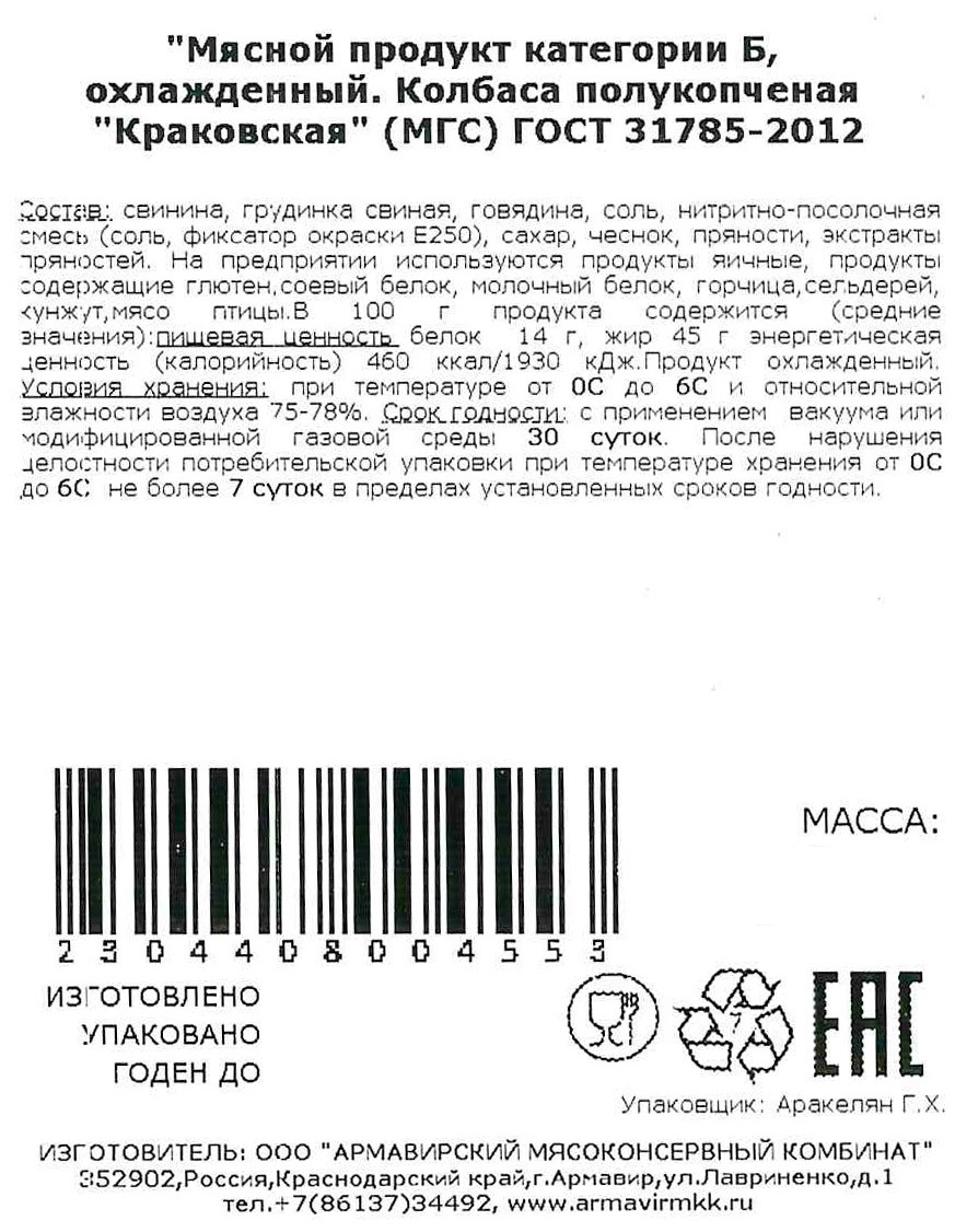 Колбаса Армавирский МК Краковская полукопченая, ~350г