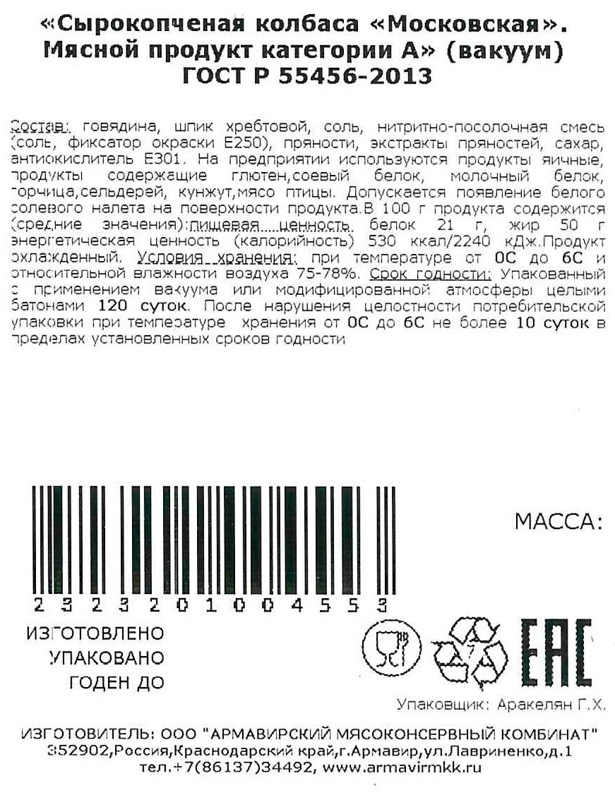 Колбаса Армавирский МК Московская сырокопченая, ~400г