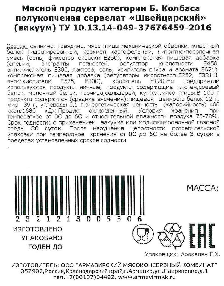 Колбаса Армавирский МК Сервелат швейцарский полукопченая, ~500г