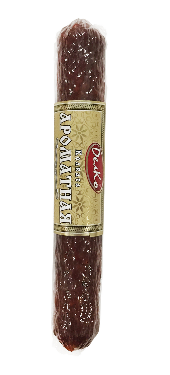 Колбаса Ароматная Делко сырокопченая, 200г представляет собой вкусный мясной деликатес, который отличается насыщенным, интересным вкусом и приятным ароматом. Он производится по особенной рецептуре и имеет плотную консистенцию, благодаря чему нарезка получается ровной и тонкой. Нежные ломтики идеально лягут между свежими хрустящими кусками хлебобулочного изделия. Такой бутерброд может стать хорошим вариантом завтра��а или быстрого перекуса во время перерыва на учебе, работе. Колбаса отлично дополнит мясную тарелку, подаваемую к обеденному или праздничному столу. Из нее получаются вкусные холодные и горячие закуски, омлет, солянка, выпечки, салаты и многое другое. Мясное изделие хорошо сочетается с сыром, овощами, зеленью, листьями капусты, пенными напитками.