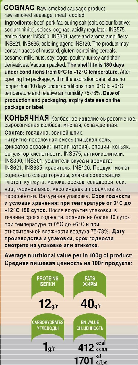 Говядина, свиной шпик, нитритно-посолочная смесь (пищевая соль, фиксатор окраски: нитрит натрия), специи, коньяк, регулятор кислотности: INS575, антиокислители: INS300, INS301, усилители вкуса и аромата: INS621, INS635, краситель: INS120.