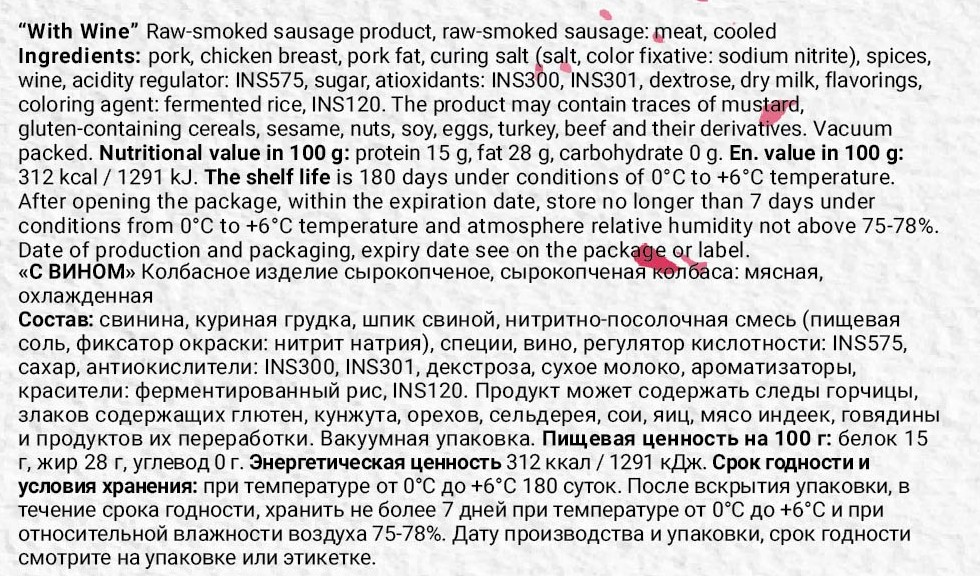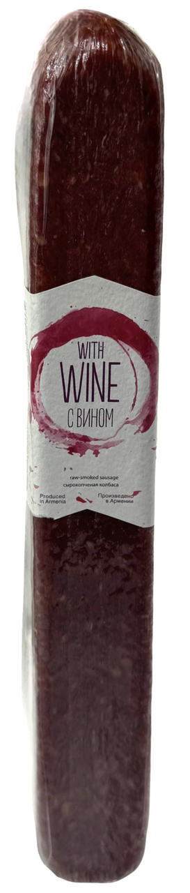 Сырокопченая колбаса с вином - истинный шедевр гастрономического искусства, идеальный выбор для любителей оригинальных вкусов. Колбаса хорошо сочетается с различными продуктами при сервировке стола: сырными, овощными и фруктовыми нарезками. Подходит для любого случая: будь то торжественный ужин или уютный семейный вечер. Благородное сочетание аромата вина и копчения придают изделию изысканный вкус. Тонко нарезанные ломтики колбасы с кусочками шпика украсят как повседневный ужин, так и праздничный стол.