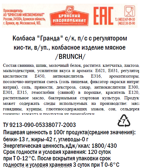 Свинина, шпик, молочный белок, растительная клетчатка, лактоза, мальтодекстрин, усилители вкуса и аромата: Е621, Е631, регулятор кислотности E450, антиокислитель Е316, ароматизаторы, посолочно-нитритная смесь соль пищевая, фиксатор окраски нитрит натрия, соль, пряности, декстроза, сахар, антиокислители Е300, Е301, Е315, гемоглобин свиной в порошке, краситель Е120, растительное масло, бактериальная стартовая культура.