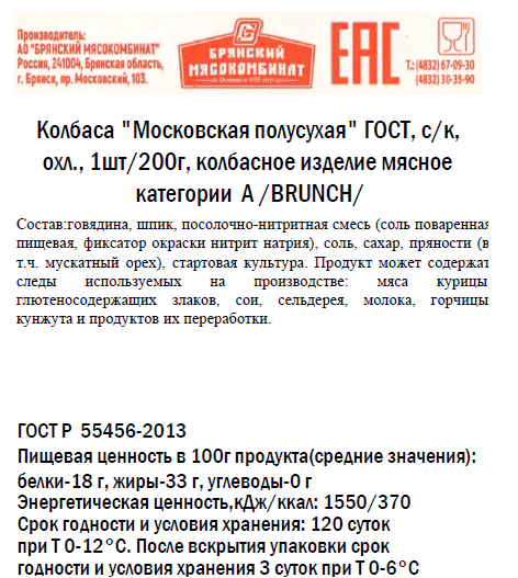 Колбаса Brunch Московская сырокопченая полусухая ГОСТ, 200г