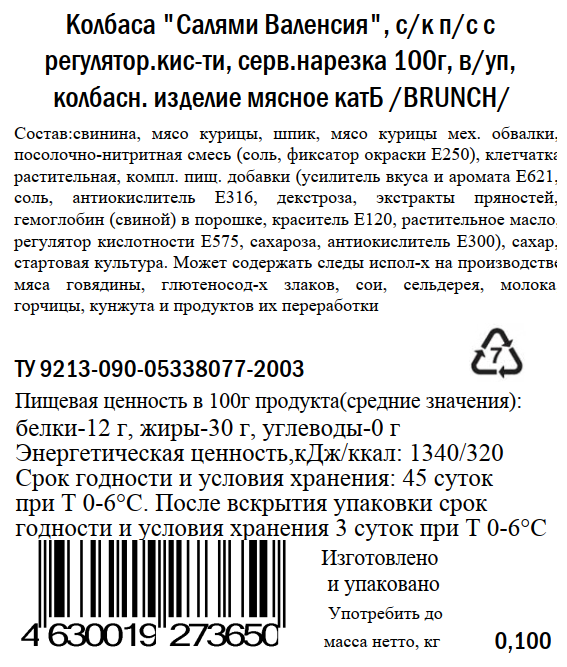 Колбаса Brunch Валенсия салями сырокопченая нарезка, 100г