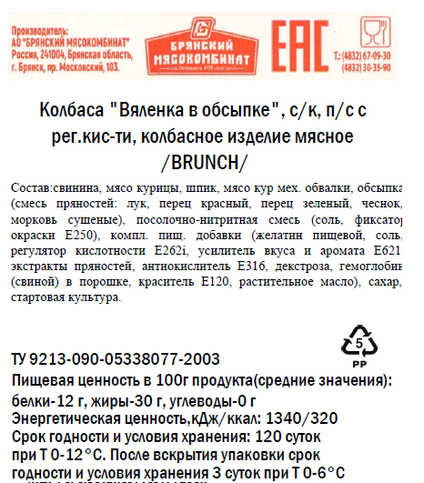 Свинина, мясо курицы, шпик, мясо кур механической обвалки, обсыпка смесь пряностей: лук, перец красный, перец зелёный, чеснок, морковь сушёные, посолочно-нитритная смесь соль, фиксатор окраски Е250, комплексные пищевые добавки желатин пищевой, соль, регулятор кислотности Е262i, усилитель вкуса и аромата Е621, экстракты пряностей, антиокислитель Е316, декстроза, гемоглобин свиной в порошке, краситель Е120, растительное масло, сахар, стартовая культура.