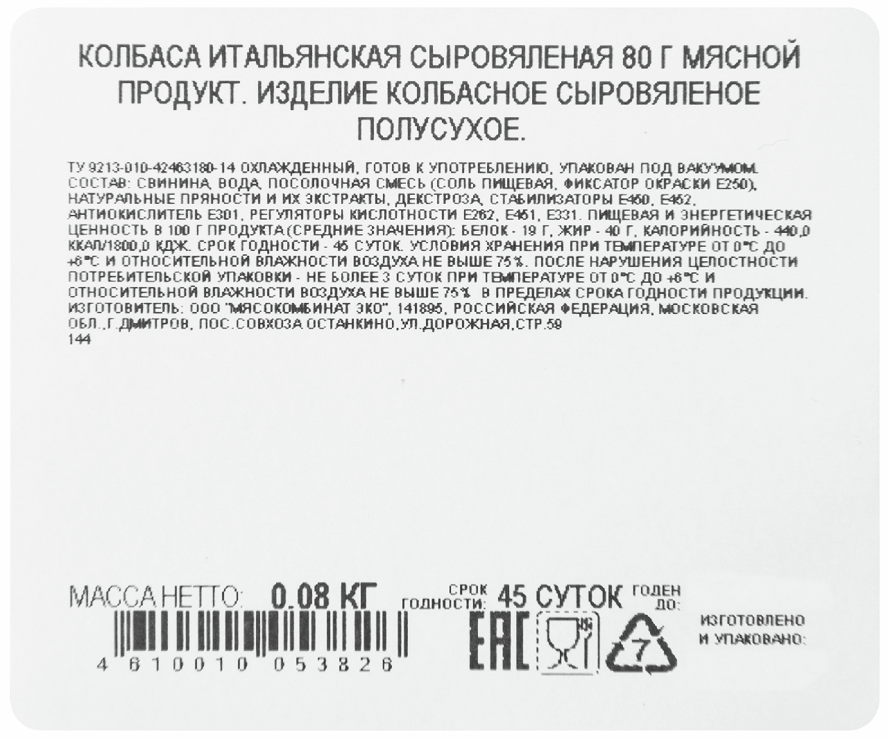 Свинина, шпик, вода питьевая, посолочная смесь (соль поваренная пищевая, фиксатор окраски: нитрит натрия), смесь специй, регуляторы кислотности (трифосфат, пирофосфат натрия), антиокислитель (аскорбат натрия).