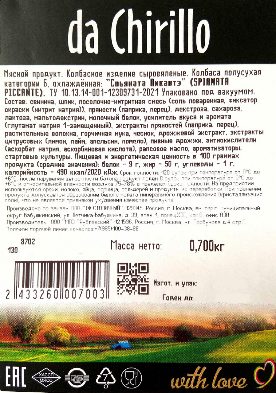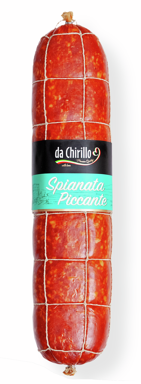 Колбаса Da Chirillo Spianata Piccanto сыровяленая, ~750г приготовлена по особой рецептуре из отборных ингредиентов – свинины с добавлением небольшого количества шпика и ароматных пряностей. Она обладает мелкозернистой структурой, упругой консистенцией, сухостью, пикантным, оригинальным вкусом и приятным ароматом. Продукт не содержит ГМО и других вредных добавок. В состав входят различные витамины, положительно влияющие на организм человека. Благодаря достаточно высокой калорийности мясное изделие быстро утоляет голод и дарит заряд сил, энергии. Колбаса может понравиться взрослым и детям. Эффектно нарезанные ломтики могут занять достойное место на тарелке с мясной нарезкой. Колбаса идеально гармонирует с хлебобулочным изделием, вареными овощами, мягким, твердым сыром и зеленью. Из нее получаются питательные закуски, салаты, бутерброды и многое другое.