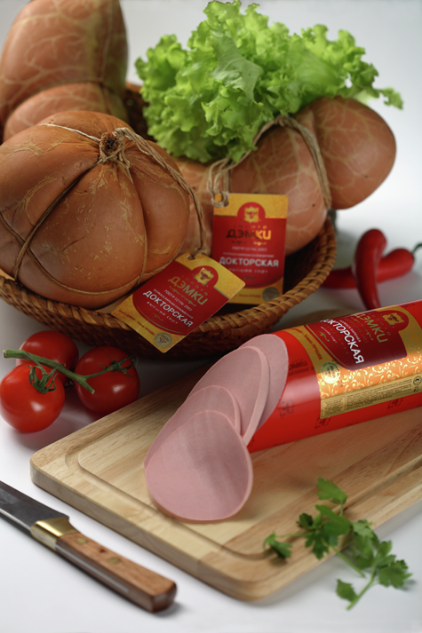 Колбаса Дэмка Докторская вареная высший сорт ГОСТ – это мясное изделие, отличающееся плотной, упругой структурой, однородной консистенцией розового цвета, насыщенным, ярко выраженным вкусом и приятным ароматом, который может понравиться как взрослым, так и детям. Она производится в виде цилиндра и упаковывается в искусственную оболочку. В основе лежит свежее свиное и говяжье мясо с добавлением пряностей. Не содержит ГМО и вредных добавок. В состав входят множество витаминов и минералов, оказывающих положительное воздействие на организм. Селен участвует в синтезе гормонов. Он необходим для нормальной деятельности щитовидной железы. Аккуратно нарезанная колбаса станет настоящим украшением обеденного или праздничного стола. Она может стать традиционным дополнением к хлебобулочным изделиям на завтрак, обед или ужин. Мясной продукт можно жарить, добавлять к омлету, яичнице, солянке, тушеным овощам или использовать вместе отварного мяса для приготовления салатов. Колбаса идеально сочетается с картофелем, яйцами, зеленым горохом, кукурузой, зеленью.