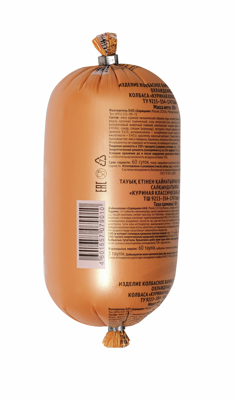 Мясо курицы механической обвалки, вода питьевая, белковый стабилр (кожа индейки, вода), крахмал картофельный, соевый белок, соль нитритная (соль, фиксатор окраскинитрит натрия), комплексные пищевые добавки (регулятор кислотности Е451i, стабилизаторы Е 450i. Е 450 iii. Е339i, загустители, гуаровая камедь, камедь рожкового дерева, ксантановая камедь, глюкоза, экстракты пряностей: мускатный орех, мускатный цвет, перец черный, перец душистый, декстроза, ароматизатор), краситель красный рисовый, Продукт может содержать следы, используемых на производстве: мяса баранины, говядины, молочного белка, пшеничной муки.