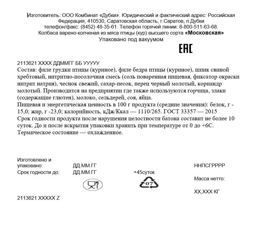 Мясо птицы, говядина, шпик хребтовый, свинина, вода, посолочная смесь (соль поваренная пищевая, фиксатор окраски Е250), регулятор кислотности Е575, стабилизатор Е450, сахар-песок, перец черный молотый, орех мускатный молотый, красители (ферментированный рис, Е120).