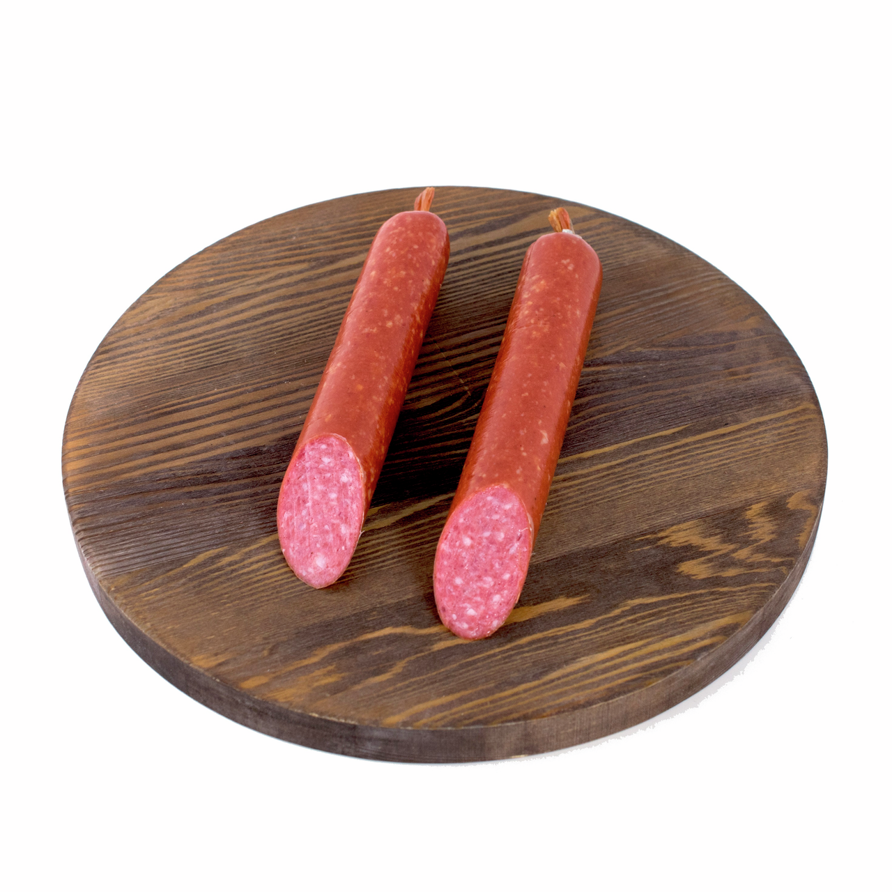 Колбаса Дымов салями Охотничья экспедиция варено-копченая, 180 г станет прекрасным выбором для тех, кто любит классику. Она представляет собой традиционный батон небольшого диаметра. На срезе видно, что колбаса имеет среднезернистую, маслянистую и жирную текстуру. Просматриваются вкрапления белого шпика на фоне нежно-розового мяса. Батон хорошо нарезается, не крошится, получаются тонкие аппетитные ломтики с ароматом копчения, которые можно и в нарезку добавить, и на бутерброды положить. Вкус у деликатеса яркий, насыщенно-мясной.