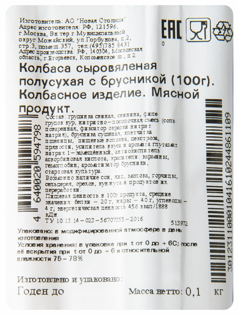 Свинина, грудинка свиная, филе грудок кур, брусника сушёная, молоко сухое, нитритно-посолочная смесь (соль поваренная, фиксатор окраски нитрит натрия 0,6%), пищевые волокна, декстроза, чеснок, мускатный орех, усилитель вкуса и аромата глутамат натрия 1-замещённый, антиокислитель изоаскорбат натрия, красители: кармины, гемоглобин; ароматизатор брусники, стартовая культура. Возможно наличие сои, яиц, глютена, горчицы, сельдерея и продуктов их переработки.