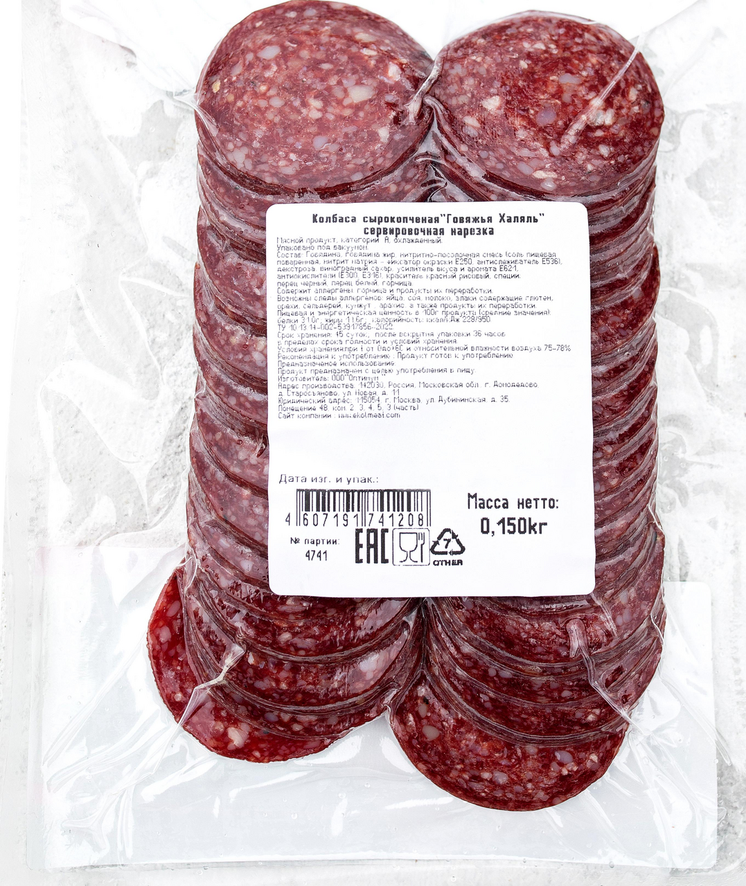 Колбаса Эколь Говяжья халяль сырокопченая, 150г сделана из охлажденной фермерской говядины и белоснежного шпика, который формирует аппетитный срез. Пикантные нотки во вкусе и аромате придают ей пряности. Продукт среднезернистой структуры предусмотрительно нарезан на тонкие слайсы. Это существенно сокращает время на подготовку праздничного или повседневного стола. Небольшую упаковку удобно взять с собой на пикник, работу или в путешествие. С колбасой получаются питательные бутерброды, сэндвичи, канапе, которые можно дополнить твердым сыром, листовым салатом, свежими овощами. Ее можно использовать как начинку в несладкой выпечке — пирогах, пицце, а также запеканках. Благодаря средней калорийности (228 ккал в 100 г) продукт легко утоляет чувство голода, придает сил, повышает работоспособность и заряжает энергией на весь день. Колбаса поставляется в искусственной оболочке, которая защищает ее от преждевременной порчи, легко снимается при необходимости.