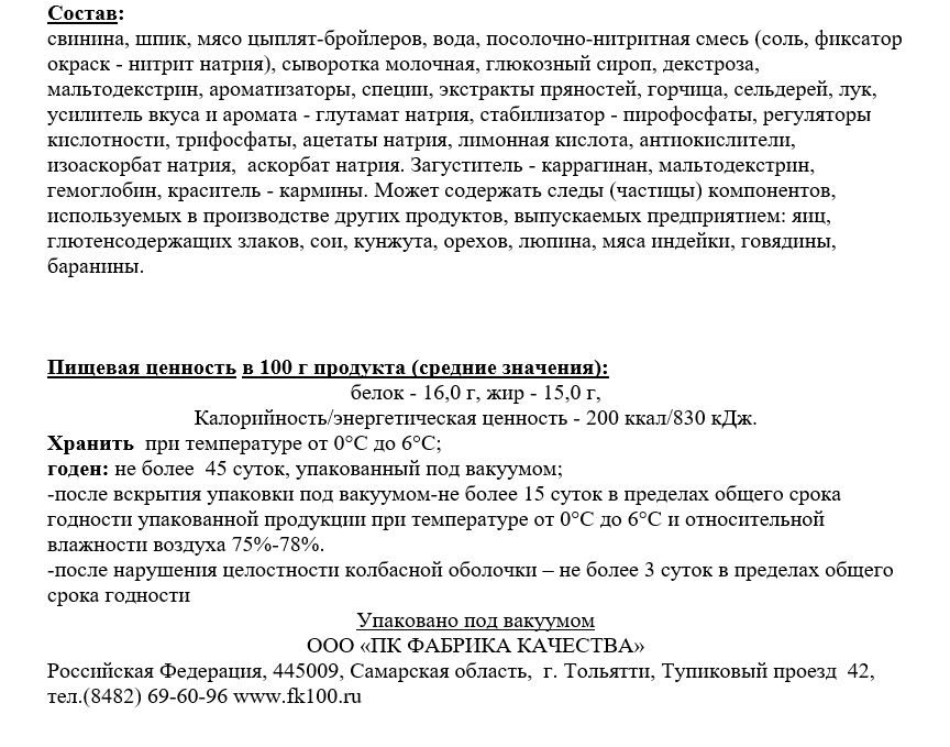 Свинина, посолочная смесь (соль, нитрит натрия), экстракты пряностей, декстроза, стабилизаторы (пирофосфаты, полифосфаты), регуляторы кислотности (трифосфаты), усилитель вкуса и аромата (глутамат натрия), антиокислитель (аскорбат натрия), ароматизаторы.