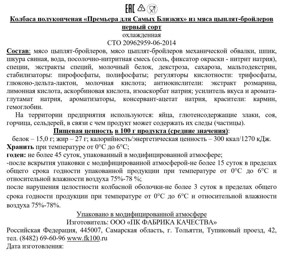 Колбаса Фабрика качества Премьера Для самых близких полукопченая, ~339г отличается аппетитным внешним видом, пикантным, интересным вкусом, мелкой зернистостью и приятным ароматом. В процессе изготовления используется мясо кур, благодаря чему продукт обладает высокой энергетической ценностью. Грамотно подобранная композиция специй придает колбасе особую изюминку и насыщенность. Продукт хорошо усваивается и благоприятно влияет на работу пищеварительной системы при умеренном употреблении. Он не содержит вредные добавки. В состав входят различные витамины, микроэлементы и аминокислоты. Мясное изделие можно использовать для приготовления холодных, горячих закусок, бутербродов, а также оно гармонично сочетается с любыми гарнирами, зеленью и соусами. Колбасу можно мелко нарезать и добавить в пиццу, салат.