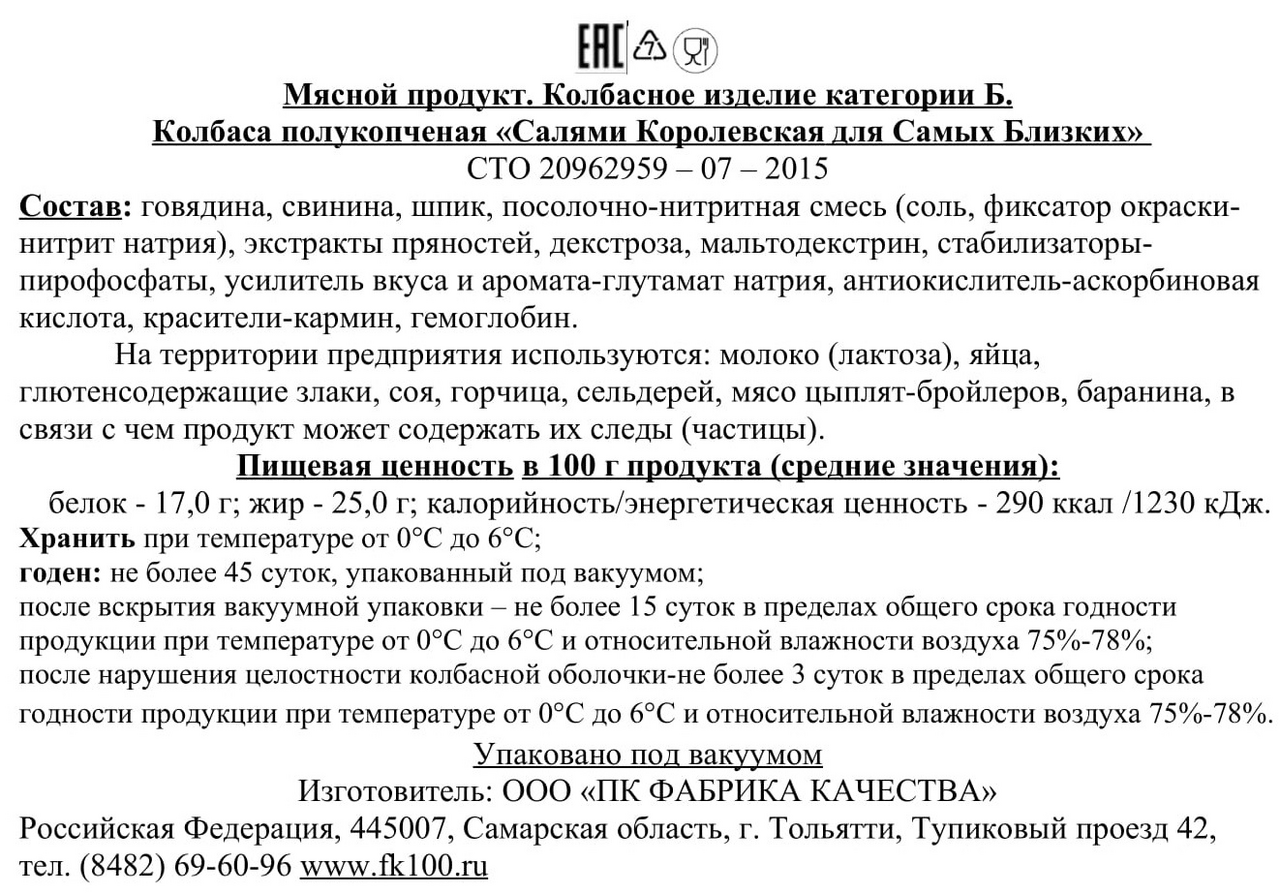 Колбаса Фабрика качества Салями королевская для самых близких полукопченая, 400г