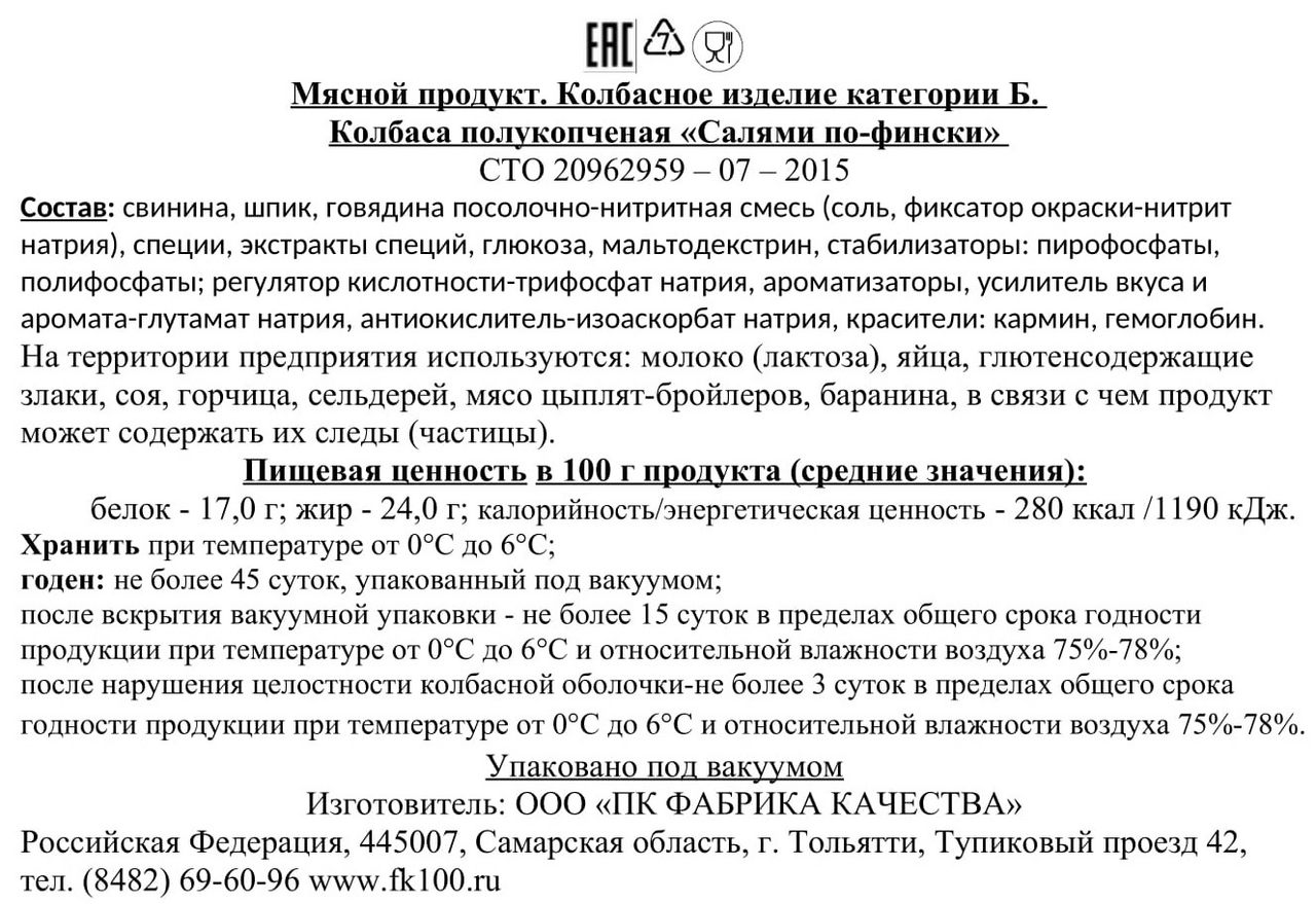 Свинина, шпик, говядина посолочно-нитритная смесь (соль, фиксатор окраски - нитрит натрия), специи, экстракты специй, глюкоза, мальтодекстрин, стабилизаторы: пирофосфаты, полифосфаты; регулятор кислотности - трифосфат натрия, ароматизаторы, усилитель вкуса и аромата - глутамат натрия, антиокислитель - изоаскорбат натрия, красители: кармин, гемоглобин.
