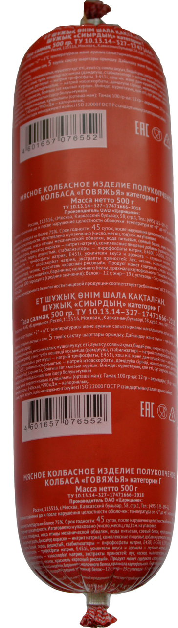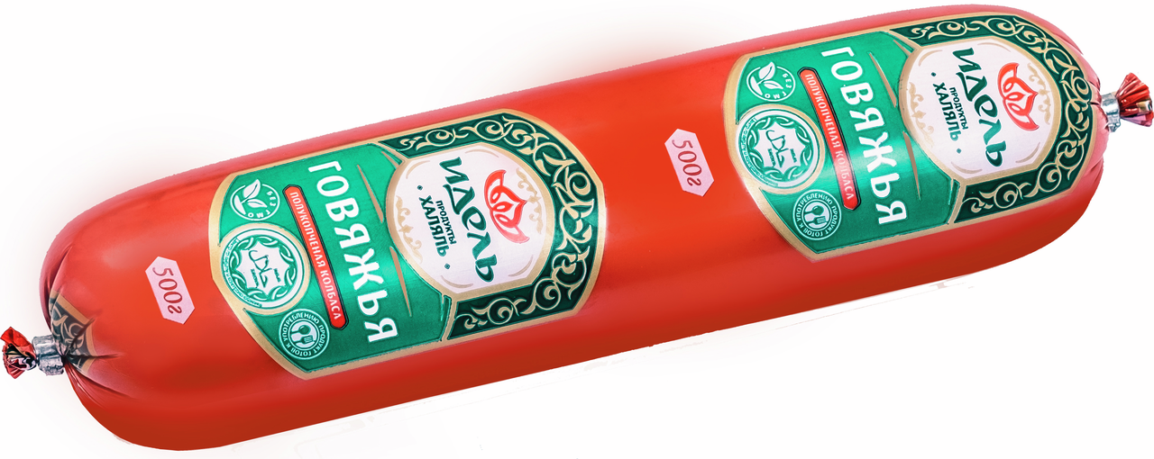 Говядина, мясо птицы механической обвалки, вода питьевая, соевый белок, мука пшеничная, соль нитритная, фиксатор окраскинитрит натрия, комплексные пищевые добавки, пряности, перец черный, белый перец, перец душистый, стабилизаторы, пирофосфаты натрия, Е450i, Е450iii, E339i, регулятор кислотности трифосфаты натрия, Е451i, усилитель вкуса, аромата глутамат натрия, Е627, Е631, антиокислитель: изоаскорбат натрия, экстракты пряностей: лук, чеснок, мальтодекстрин, декстроза, ароматизатор, чеснок, краситель, красный рисовый, Продукт может содержать следы, используемых на производстве: мяса баранины, индейки, молочного белка, крахмала картофельного.