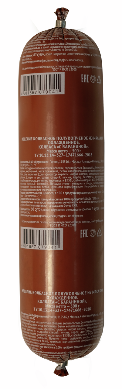 Мясо куриное механической обвалки, белковые стабилизаторы (кожа индейки, белок животный говяжий), вода питьевая, жир бараний, мука пшеничная, соевый белок, соль нитритная (соль, фиксатор окраски- нитрит натрия), комплексные пищевые добавки (специи и экстракты специй: кумин, перец, декстроза, антиокислитель аскорбиновая кислота, регулятор кислотности E451i, стабилизаторы Е450i, E450iii, E339i), краситель "красный рисовый".