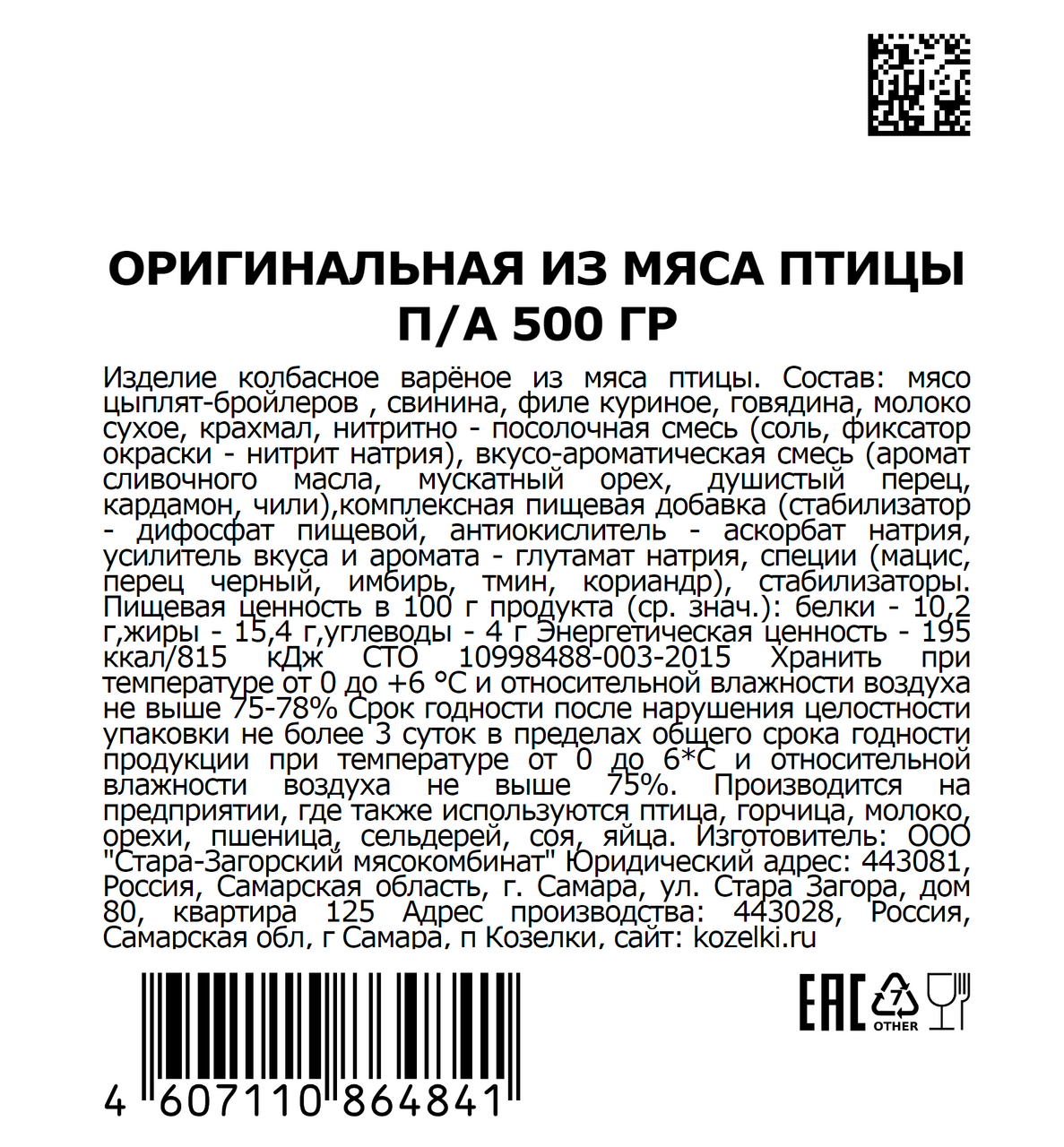 Колбаса из мяса птицы Козелки оригинальная вареная, 500г