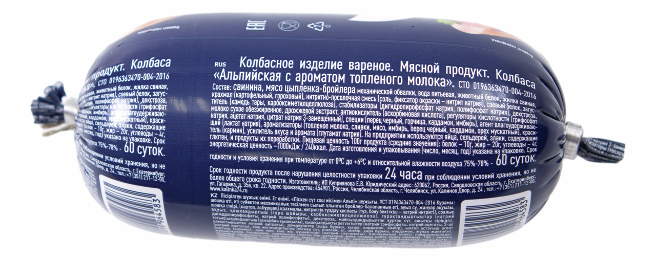 Аппетитный мясной продукт, изготовленный из охлажденной свинины и курицы с добавлением молока и специально подобранным набором специй по эксклюзивному рецепту. Колбасное изделие обладает неповторимым индивидуальным вкусом и ароматом. В основе рецептуры - свежая свинина и мясо цыпленка бройлера. Отличительной особенностью является добавление небольшого количества натурального топленого молока, которое придает колбасе особую изюминку. При нарезании колбасы ломтиками, молочно-топлёный запах распространяется на всю комнату. Ломтик Альпийскойв сочетании с хлебом может стать сытным, питательным вариантом завтрака для всех членов семьи. Эта колбаса станет настоящим украшением повседневного и праздничного стола. Из нее получаются аппетитные первые и вторые блюда, салаты, закуски, сэндвичи и многое другое. Куда бы ни был добавлен продукт, он сделает блюдо оригинальным и пикантным. Эта колбаса с нежным ароматом топленого молока идеально сочетается с сыром, хлебом, маринованными огурцами, свежими овощами. Выпускается в искусственной оболочке с привлекательным дизайном, большая упаковка идеально подойдет для большой семьи.