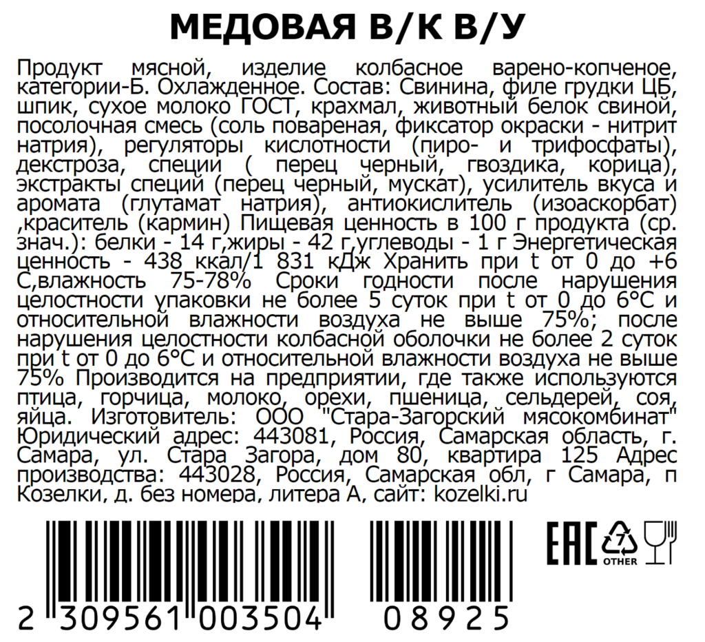 Колбаса Козелки Медовая варено-копченая, ~350г
