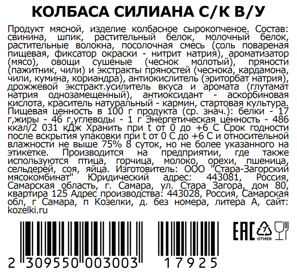 Свинина, шпик, растительный белок, молочный белок, растительные волокна, посолочная смесь (соль поваренная пищевая, фиксатор окраски - нитрит натрия), ароматизатор (мясо, овощи сушеные (чеснок молотый), пряности (пажитник, чили) и экстракты пряностей (чеснока, кардамона, чили, кумина, кориандра), антиокислитель (эриторбат натрия), дрожжевой экстракт, усилитель вкуса и аромата (глутамат натрия однозамещенный), антиоксидант - аскорбиновая кислота, краситель натуральный - кармин, стартовая культура.