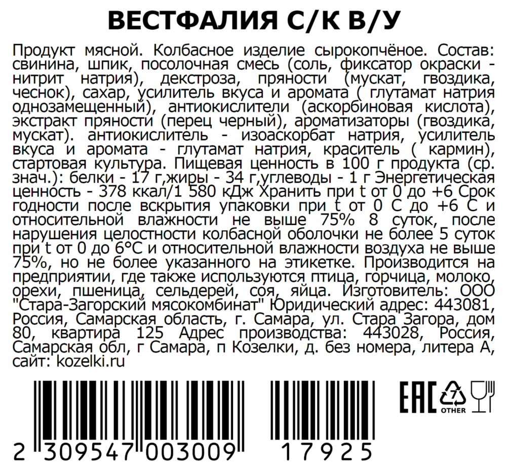 Колбаса Козелки Вестфалия сырокопченая, ~300г