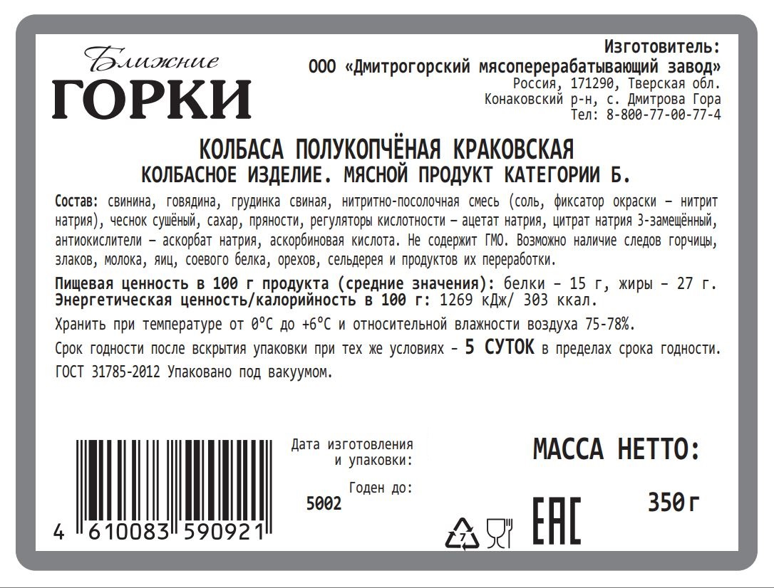 Колбаса Краковская Ближние горки полукопченая ГОСТ, 350г