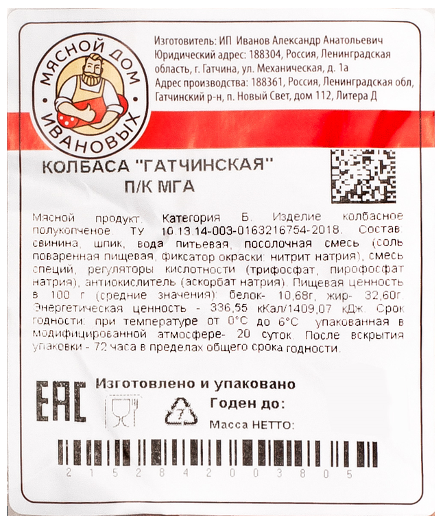 Колбаса МД Ивановых Гатчинская полукопченая, ~400г