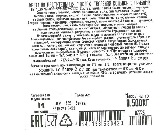 Уникальный продукт с натуральными грибами для поста, практически не имеющий аналогов на рынке. Идеально подходит для завтрака или быстрого перекуса. Создана с применением традиционных технологий и собственной рецептуры производителя. Это нежный крем на растительных маслах светло-розового цвета на срезе. Вкрапления крупных кусочков натуральных шампиньонов придают ему красивый и аппетитный вид. Благодаря полиамидной оболочке колбаса долго хранится и сохраняет все вкусовые качества.