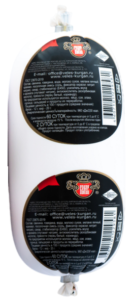 Свинина, говядина, вода питьевая, молоко сухое обезжиренное, меланж яичный сухой, соль поваренная пищевая, соль пищевая выварочная нитритная (соль пищевая, агенты антислеживающие Е535, Е500, фиксатор окраски Е250), регуляторы кислотности Е451, Е450, сахар белый, перец черный молотый, антиокислитель Е300, орех мускатный, перец душистый молотый. Продукт может содержать следы горчицы, злаков, содержащих глютен, кунжута, сельдерея, сои и продуктов их переработки.