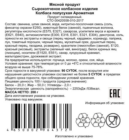 Свинина, шпик свиной, вода, нитритно-посолочная смесь (соль, фиксатор окраски Е250), животный белок (свиной), пшеничные волокна, регуляторы кислотности (Е575, Е327), сахароза, усилители вкуса и аромата (Е621, Е640), антиокислители (Е300, Е316, Е301, Е321, Е304), декстроза, соль, пряности их экстракты и овощи (перец черный, кардамон, кориандр, паприка, лук, томатный порошок, черный перец, мускатный орех, душистый перец, красный перец, гвоздика розмарин), красители (гемоглобин (свиной), Е5120, красный рисовый), экстракты (зеленый чай, виноград), белок куриных яиц (лизоцим), носители (Е1520, Е551), сахар, кукурузный крахмал, мальтодекстрин, дрожжевой экстракт.