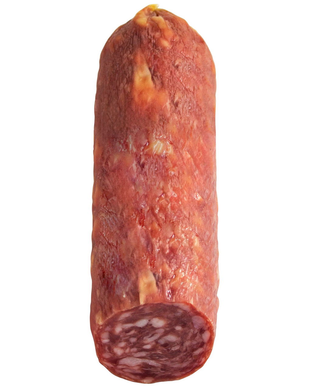 Ароматный мускатный орех, черный перец и чеснок отлично сочетаются с нежной свининой. Красивый структурный срез и цельные зерна зеленого перца делают эту колбасу заметным украшением любой мясной тарелки.Колбаса дважды раскрывается при употреблении - сочный вкус свинины и с ароматом муската сменяется терпкой остротой цельного перца - потрясающий и запоминающийся дуэт.Вкус колбасы дважды раскрывается при употреблении - сочный вкус свинины с ароматом муската сменяется терпкой остротой перца - потрясающий и запоминающийся дуэт.