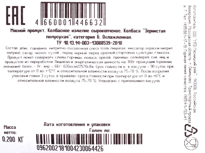 Шпик, говядина, нитритно-посолочная смесь (соль пищевая, фиксатор окраски нитрит натрия), сахар, чеснок сухой , перец черный, перец красный, стартовые культуры, глюкоза.
