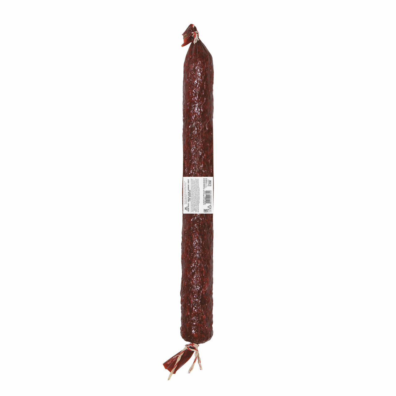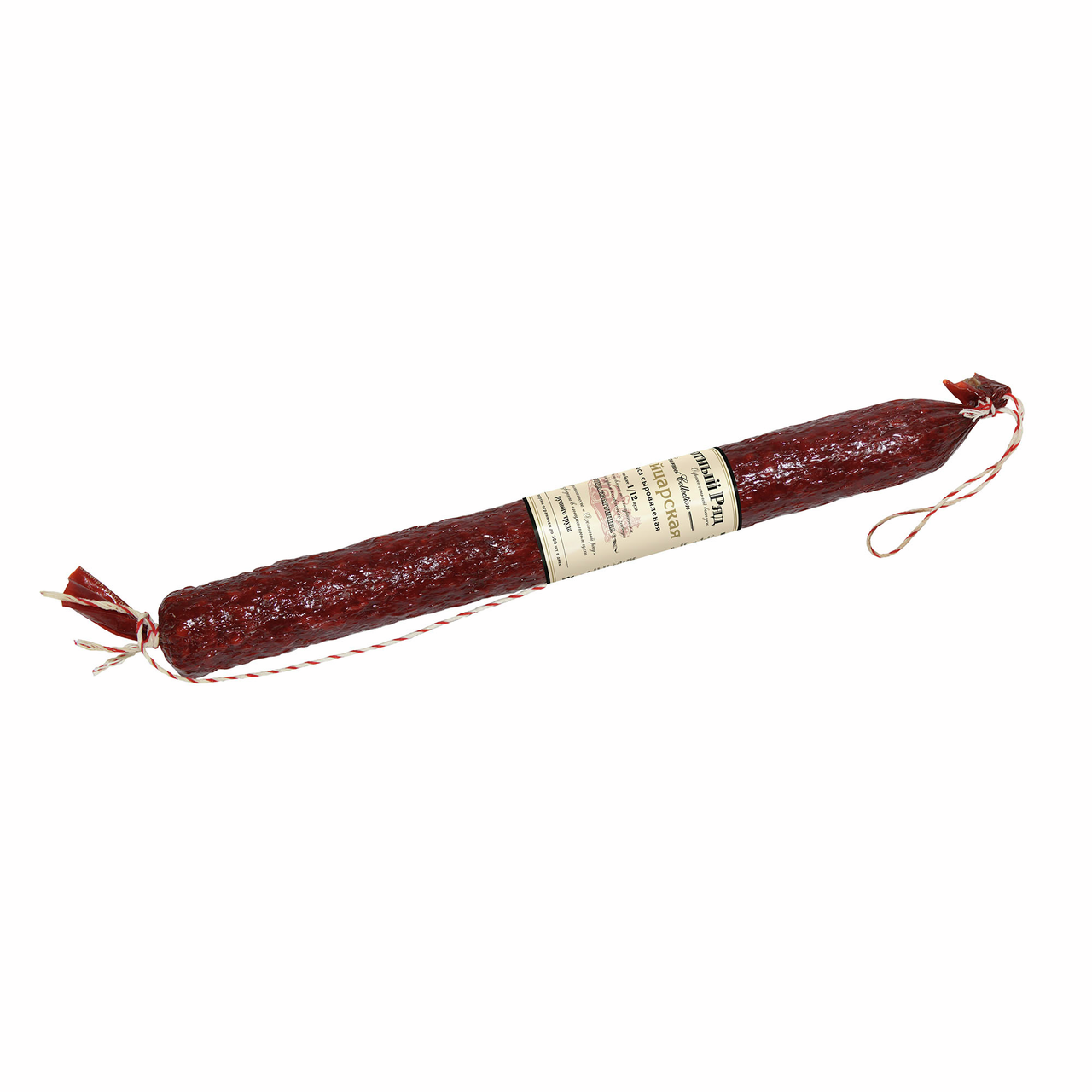 Свинина, говядина, шпик, соль, декстроза, специи (горчица, лук) и экстракты, специи (перец, мускатный орех), антиокислитель (аскорбиновая кислота), ароматизатор, фиксатор окраски (нитрит натрия), краситель пищевой (кармины).