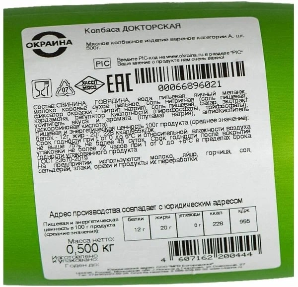 Колбаса Окраина докторская вареная ГОСТ, 500 г готовится в соответствии со всеми требованиями ГОСТа и относится к высшей категории продукта. Продукт имеет насыщенный мясной вкус и мягкий аромат, созданный букетом специй, – перца и кардамона. Он изготавливается из говядины и свинины с добавлением свежих куриных яиц и молока. Докторскую колбасу чаще всего используют для салата Оливье или для сэндвичей и бутербродов к завтраку.