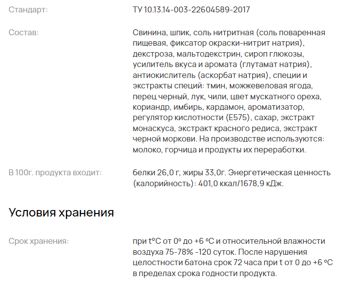 Свинина, шпик, соль нитритная (соль поваренная пищевая, фиксатор окраски-нитрит натрия), декстроза, мальтодекстрин, сироп глюкозы, усилитель вкуса и аромата (глутамат натрия), антиокислитель (аскорбат натрия), специи и экстракты специй: тмин, можжевеловая ягода, перец черный, лук, чили, цвет мускатного ореха, кориандр, имбирь, кардамон, ароматизатор, регулятор кислотности (Е575), сахар, экстракт монаскуса, экстракт красного редиса, экстракт черной моркови.