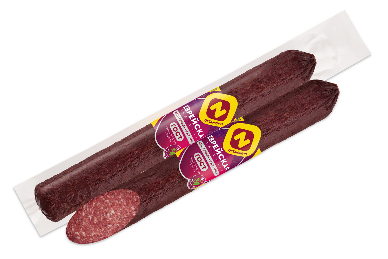 Колбаса Еврейская ГОСТ сырокопченая Останкино, ~ 525 - продукт, пользующийся огромным спросом. Многие любители мясных изделий, сделав всего лишь раз такую покупку, обязательно вернутся за ней еще раз. Это колбаса производится по ГОСТу и имеет уникальный состав: говядина высшего сорта с добавлением различных специй и чеснока. Этим и объясняется её оригинальный вкус, свойственный только говяжьему мясу. Говяжий жир в этой колбасе заменяет привычный для потребителя свиной шпик. Кубики жира в фарше совсем небольшие (около двух-трёх миллиметров). Они придают разрезу весьма интересный рисунок. Колбаса выдерживается необходимое время до полного созревания, после чего проходит процедуру копчения и получается высококачественный продукт.