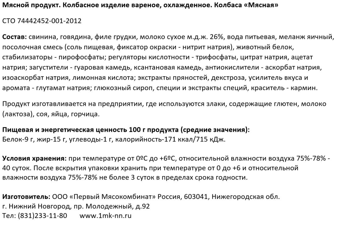 Свинина, говядина, филе грудки, молоко сухое м.д.ж. 26%, вода питьевая, меланж яичный, посолочная смесь (соль пищевая, фиксатор окраски - нитрит натрия), животный белок, стабилизаторы - пирофосфаты, регуляторы кислотности - трифосфаты, цитрат натрия, ацетат натрия, загустители - гуаровая камедь, ксантановая камедь, антиокислители - аскорбат натрия, изоаскорбат натрия, лимонная кислота, экстракты пряностей, декстроза, усилитель вкуса и аромата - глутамат натрия, глюкозный сироп, специи и экстракты специй, краситель - кармин.