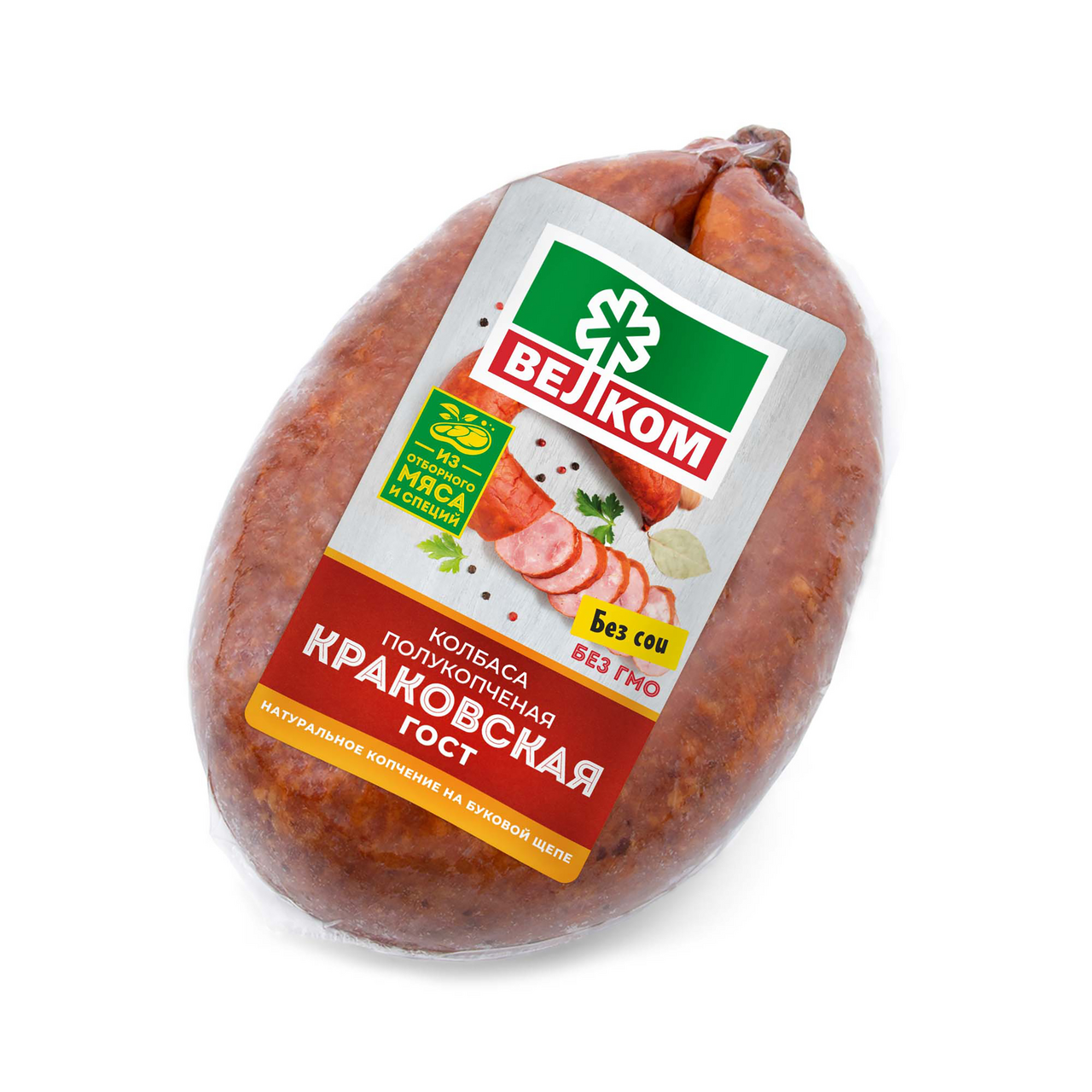 Колбаса Велком Краковская полукопченая, 360г – это вкусный продукт для всей семьи. Мясная основа такой колбасы отлично подчеркнута особыми специями. Продукт имеет приятный вкус с оттенками чеснока, кориандра, аромат натурального копчения, яркий рисунок среза и небольшое количество шпика в составе. Продукт станет хорошим ингредиентом для приготовления различных блюд: бутербродов, салатов, канапе и т. д.