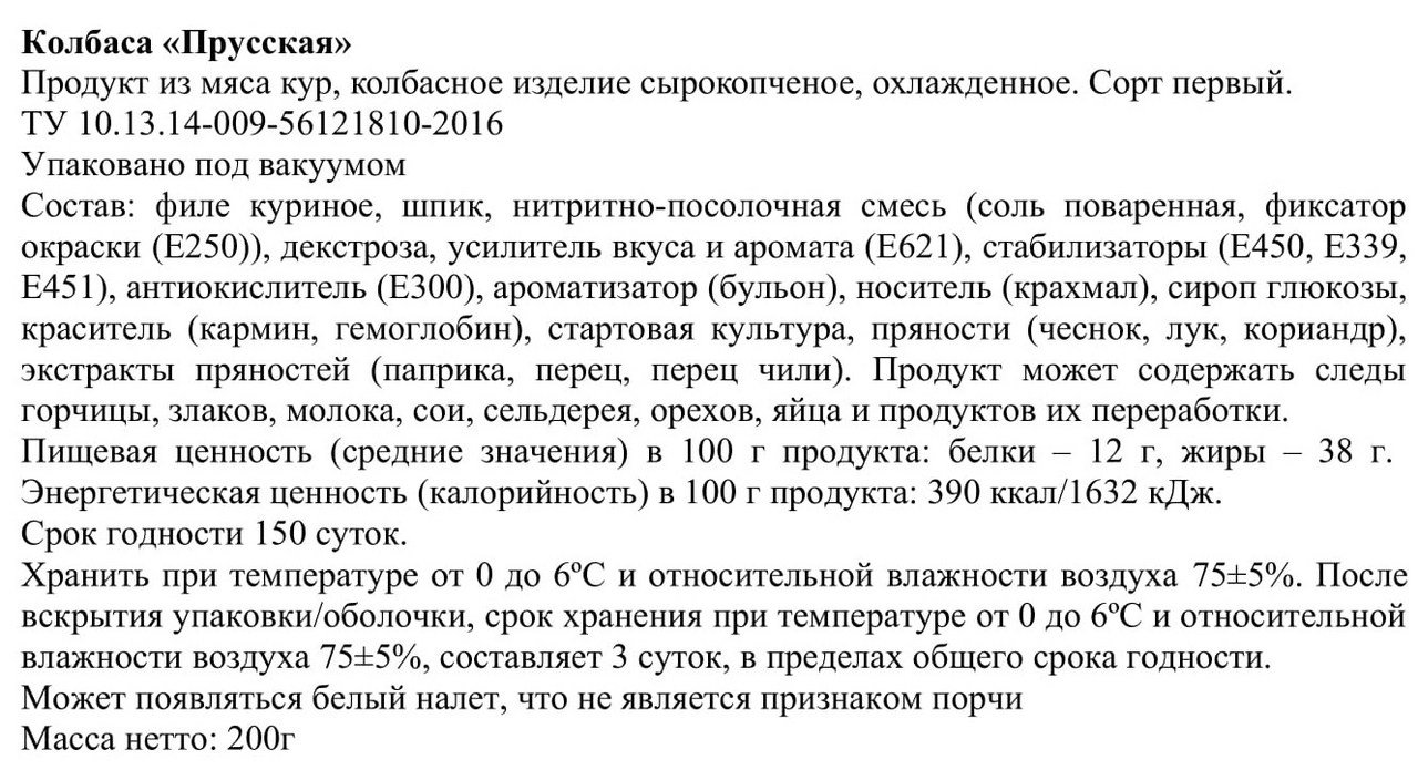 Филе куриное, шпик, нитритно-посолочная смесь (соль поваренная, фиксатор окраски (Е250)), декстроза, усилитель вкуса и аромата (E621), стабилизаторы (E450, E339, E451), антиокислитель (Е300), ароматизатор (бульон), носитель (крахмал), сироп глюкозы, краситель (кармин, гемоглобин), стартовая культура, пряности (чеснок, лук, кориандр), экстракты пряностей (паприка, перец, перец чили).