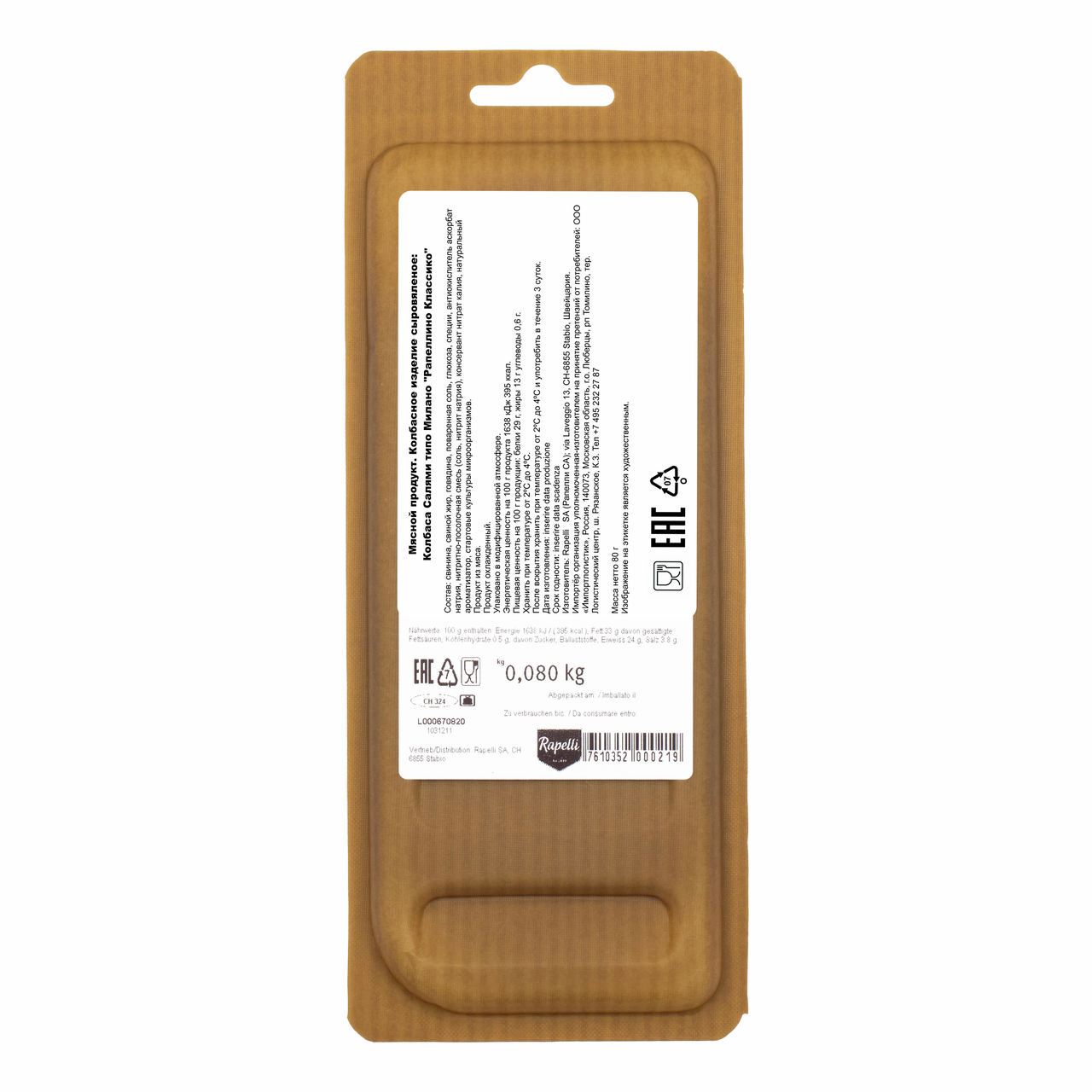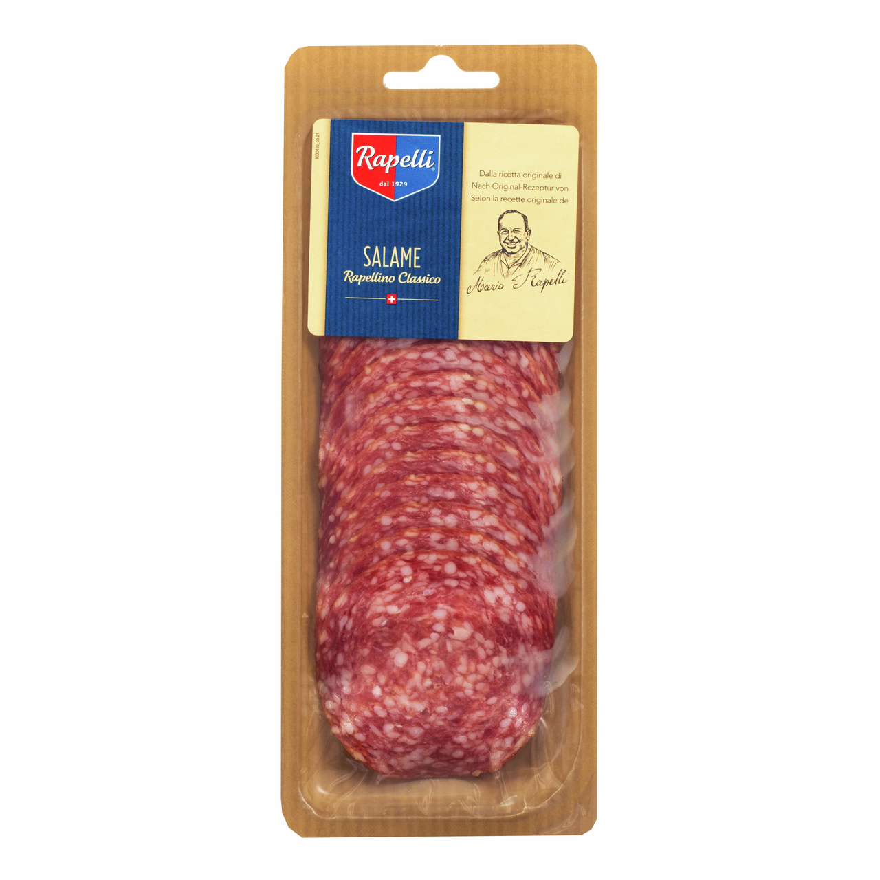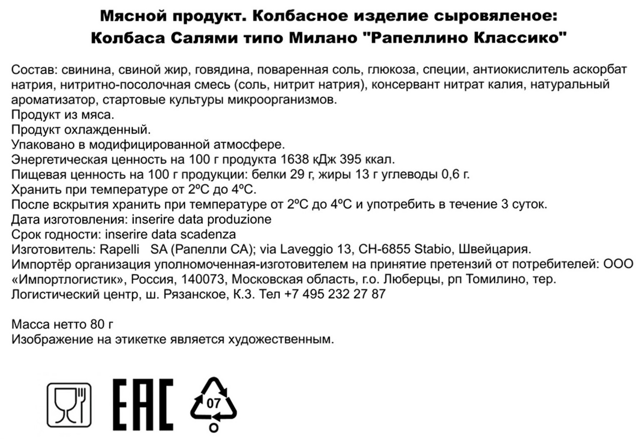 Salame Rapellino Classico (Салями Рапеллино Классико, нарезка 80г) - это аутентичный деликатес, созданный по оригинальному рецепту Марио Рапелли, основателя легендарной швейцарской марки Rapelli. Салями изготавливается вручную мастерами-салумьерами из тщательно отобранной свинины.Мясная смесь помещается в натуральную оболочку и проходит медленную выдержку от четырёх до шести недель в погребах, защищённых от света. Именно в это время салями приобретает свою неповторимую структуру и тонкий аромат, а мастера Rapelli лично определяют момент, когда продукт достигает идеального вкусового баланса. Диаметр колбасы - 75мм, что позволяет сохранить правильное соотношение между текстурой и ароматом при каждой нарезке.