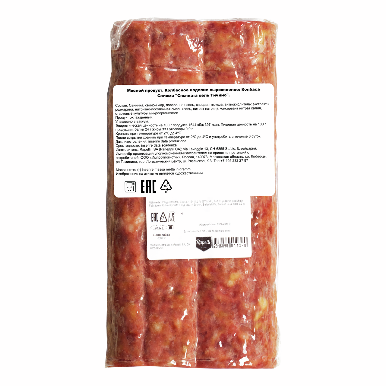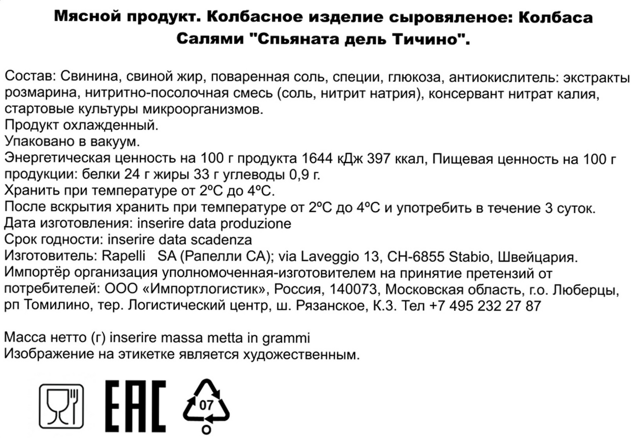 Salame Spianata del Ticino (Салями Спьяната Тичино, батон ~1,9кг) - это традиционный деликатес от мастеров Rapelli, созданный по классическому рецепту региона Тичино. Уникальная приплюснутая форма отличает эту салями от других: она не только придаёт продукту узнаваемый вид, но и способствует равномерной сушке, благодаря чему достигается идеальный баланс вкуса и текстуры.Для Salame Spianata del Ticino используется тщательно отобранное мясо - свинина и говядина, приправленные морской солью. Зернистость 7мм сохраняет структуру мяса и подчёркивает его насыщенность. После формовки салями проходит медленную сушку в специальных погребах, где мастера-салумьеры следят за влажностью и циркуляцией воздуха, чтобы продукт развил свой мягкий вкус и тонкий аромат.