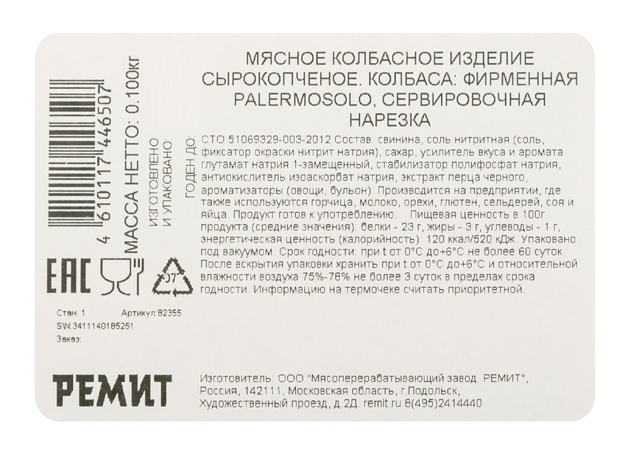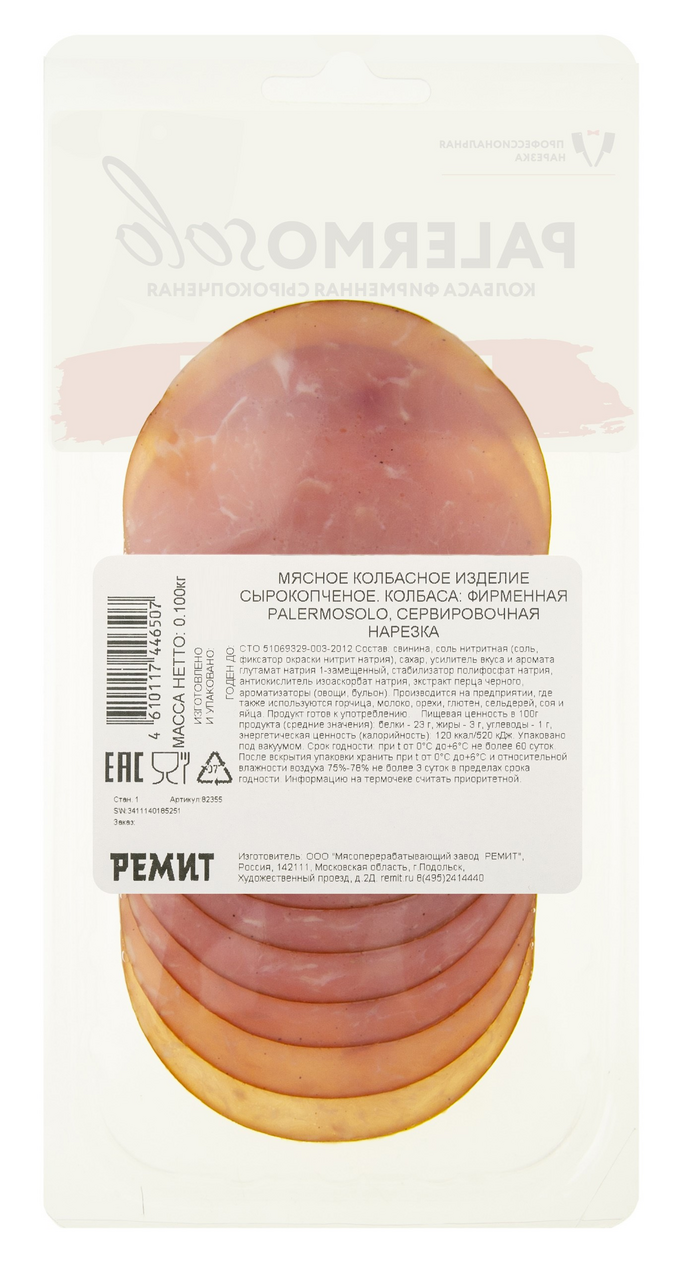 Колбаса Ремит Palermosolo сырокопченая нарезка, 100г