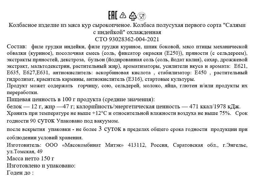 Филе грудки индейки, филе грудки куриное, шпик боковой, мясо птицы механической обвалки куриное, посолочная смесь соль пищевая, фиксатор окраски Е250, пряности с сельдерем, экстракты пряностей, декстроза, бульон йодированная соль соль поваренная пищевая, йодат калия, сахар, дрожжевой экстракт, мальтодекстрин, растительный жир, ароматизаторы, усилители вкуса и аромата: Е621, Е635, Е627, Е631, антиокислитель: аскорбиновая кислота , стабилизатор: Е450 , растительный гидролизат, краситель - кармин, антиокислитель Е316, стартовые культуры.